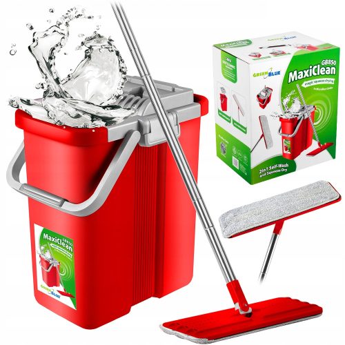 Mop GreenBlue MaxiClean GB850 wyposażony jest w wiaderko na wodę, posiadające mechanizm, umożliwiający płukanie mopa.