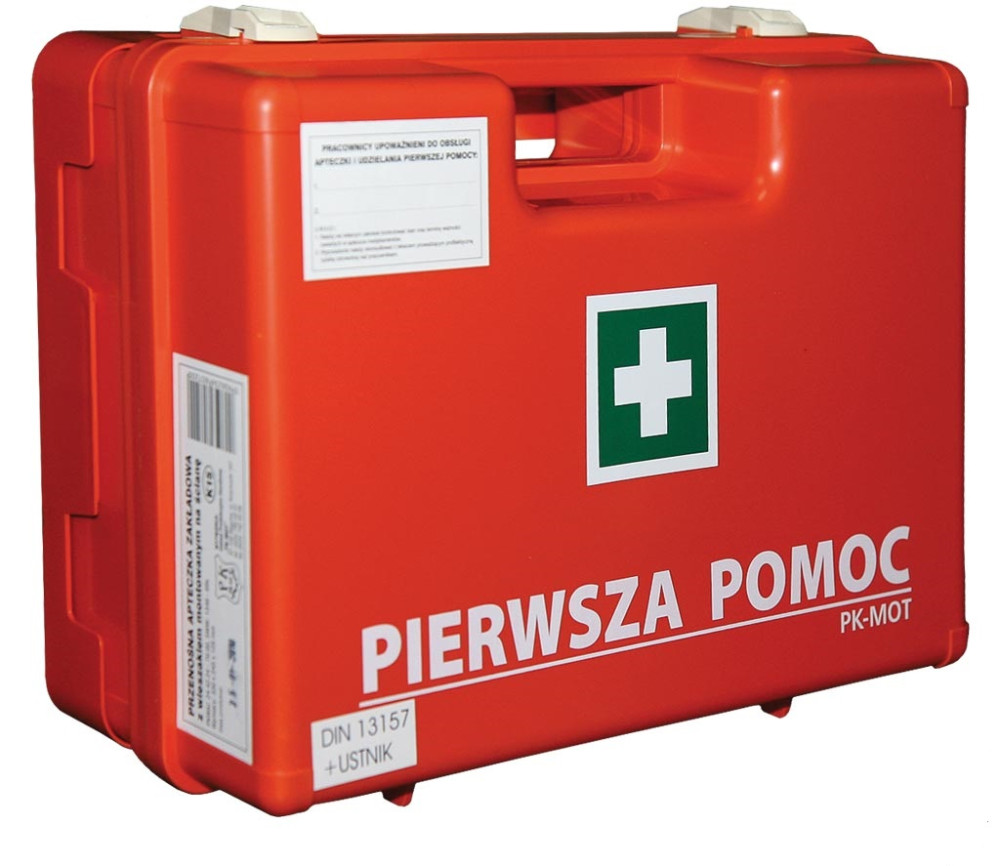 Apteczka pierwszej pomocy TYP K15  wykonana z tworzywa sztucznego (ABS) . Apteczka w zestawie zawiera wieszak , który umożliwia powieszenie jej na ścianie oraz rączkę do swobodnego przenoszenia.