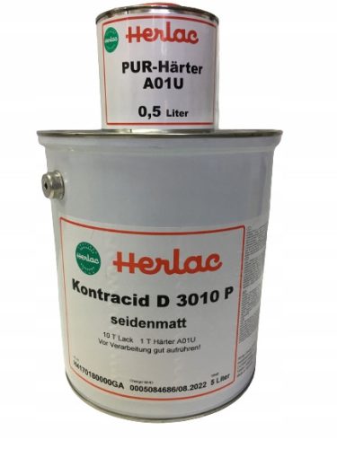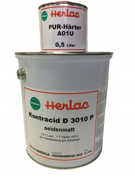 Paczka: komplet obejmuje opakowanie 5 litrów lakieru poliuretanowego Kontracid D 3010 P oraz 0,5 litra utwardzacza PUR Hearter A01 U.