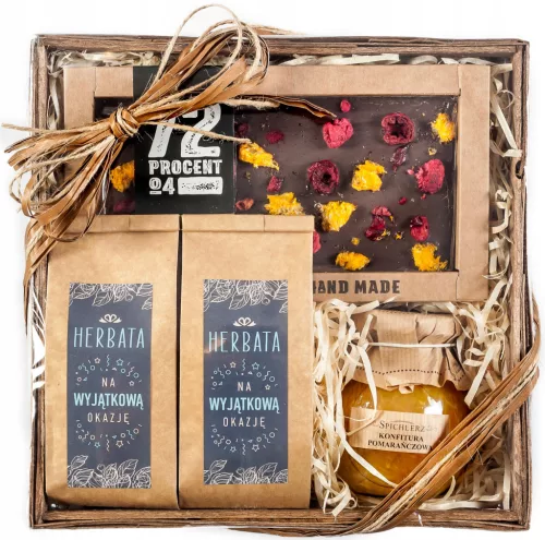 Zestaw na prezent, który oferujemy idealnie sprawdzi się na każdą okazję. Jest to świetny pomysł - oryginalny i zawsze trafiony! Zawartość opakowana jest w wysoko przeźroczystą folię celofanową. Całość dopełnia gustowna wstążka nadająca całemu zestawowi uroku oraz wyjątkowego wyglądu. Koszyk wypełniony jest estetyczną wełną drzewną. Produkty spożywcze znajdujące się wewnątrz zestawu są świeże i posiadają wyjątkowy smak, dzięki czemu ten upominek zostanie zapamiętany przez obdarowaną osobę na bardzo długo.