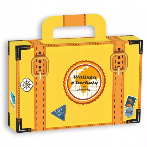 Zestaw Walizka z herbatą w podróży został stworzony z myślą o wyjazdach, piknikach i rodzinnych  spotkaniach na świeżym powietrzu. Kompozycja 14 saszetek z herbatą, o różnych smakach i rodzajach, z bawełnianym filtrem i saszetkami z cukrem trzcinowym sprawią, że nie będziesz się musiał martwić o najpotrzebniejsze zaopatrzenie do przygotowania herbaty. Jedynie czego potrzebujesz - to kubek i woda! Dodatkowo, aby zestaw idealnie wkomponował się w atmosferę wyjazdu, wszystko zamknięte zostało w opakowanie imitujące walizkę podróżną. Nawet podczas nieobecności w domu nie musisz rezygnować ze swoich ulubionych herbat! W czasie upalnych dni herbatę można zaparzyć, a następnie dodać kostki lodu i wtedy otrzymamy orzeźwiające icetea! W wersji „na ciepło” saszetki z herbatą  idealnie sprawdzą się w pokoju hotelowym lub nawet podczas chłodnych wieczorów nad ogniskiem. Ciesz się pysznymi, orzeźwiającymi smakami herbat, gdziekolwiek jesteś!