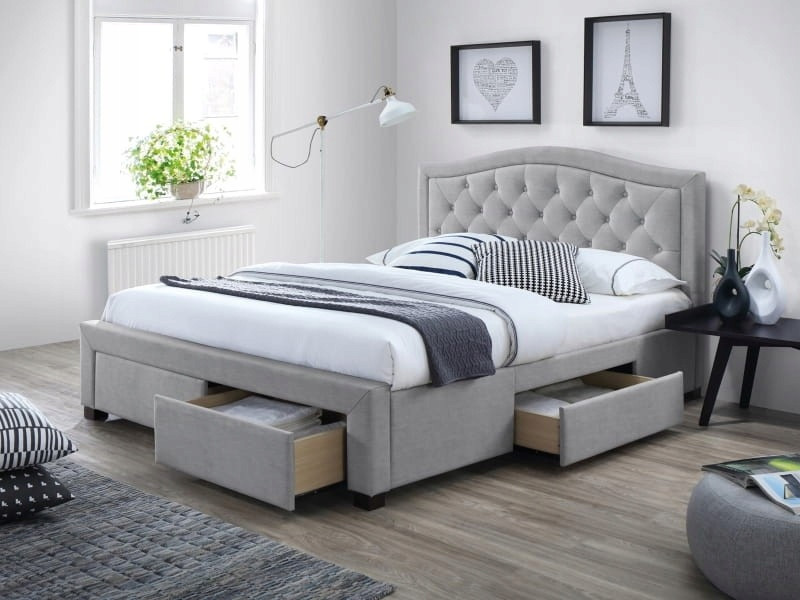 Komfortowe i praktyczne łóżko dwuosobowe do sypialni Electra 160x200. Łózko tapicerowane z wysokim zagłówkiem o pięknym pikowaniu pozwoli wygodnie usiąść i poczytać książkę bądź obejrzeć ulubiony serial. Dodatkowo, łóżko posiada 4 wysuwane szuflady na pościel. Szary kolor łóżka zapewni uniwersalność i dopasowanie do każdej aranżacji.