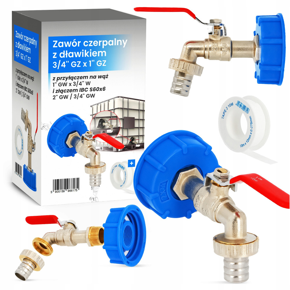 Zawór czerpalny z dławikiem 3/4'' GZ x 1'' GZ z przyłączem na wąż 1'' GW x 3/4'' W i złączem IBC S60x6 2'' GW / 3/4" GW