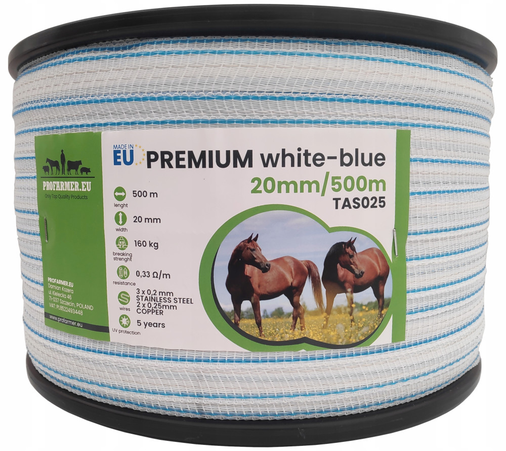 Nasze taśmy gamy PREMIUM mogą być wykorzystywane zarówno DO BUDOWY KRÓTKICH, ŚREDNICH, DŁUGICH I BARDZO DŁUGICH PASTUCHÓW ELEKTRYCZNYCH aż do 18km. Połączenie grubych drucików miedzianych oraz stalowych ocynkowanych zapewnia doskonałą przewodność i sprawia, że nawet przy długich ogrodzeniach spadek napięcia na końcu linii jest niewielki. Taśma PREMIUM posiada niebieskie brzegi przez co jest lepiej widoczna dla zwierząt. Z badań wynika, że zwierzęta są najbardziej wrażliwe na kolory w zakresie kolorów: niebieskich, fioletowych, ultrafiooletowych. Taśma jest dodatkowo wzmocniona, dzięki czemu posiada większą wytrzymałość na zerwanie oraz dłuższą ochronę na promieniowanie UV.