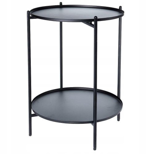 Nowoczesny stoliczek kawowy dwupoziomowy na czterech stabilnych nóżkach wykonany w całości z metalu pokrytego czarnym lakierem. Stolik posiada dolną półkę na której można położyć książki bądź czasopisma. Blat może pełnić również funkcję tacy. Całość jest składana, tace są zdejmowane. Doskonałe dopełnienie aranżacji w stylu LOFT. Maksymalne obciążenie to 5kg.