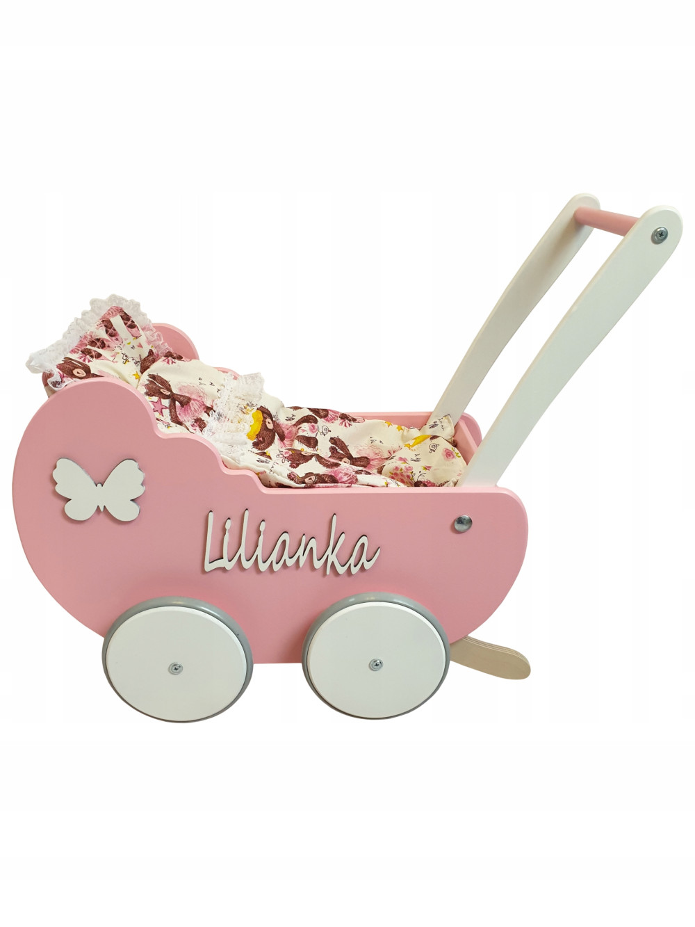 Przykładowy wózek kolor różowy  +białe dodatki + dwustronny dekor  + dowolna personalizacja
