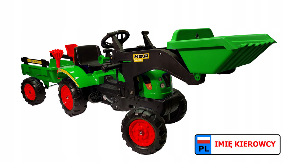 Traktor na pedały z przyczepą i ruchomym ładowaczem oraz tablicą rejestracyjną w formie naklejki, to idealny prezent dla dziecka.