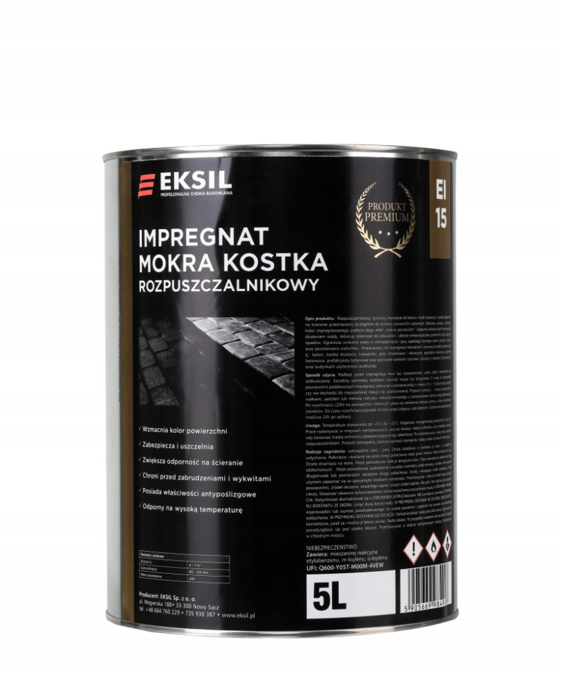 EI 15 to impregnat do betonu i kostki brukowej o wysokiej odporności na ścieranie przeznczony szczególnie do ochrony powierzchni poziomych. Odświeża, wyciąga i wyrównuje kolor impregnowanego podłoża dając efekt ,,mokrej powierzchni”. Zapewnia ochronę przed niekorzystnym działaniem wody, redukuje skłonność do zabrudzeń i ułatwia samooczyszczanie powierzchni pod wpływem opadów. Ogranicza wnikanie wody w mikropęknięcia i pory, zapobiega rozwojowi pleśni, grzybów, mchów, oraz powstawaniu wykwitów.