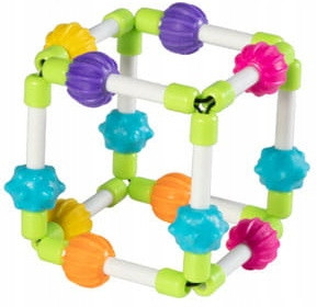 Każda krawędź Sześcianiku Quubi połączona jest elastycznymi gumkami, aby małe rączki mogły je zgniatać, zginać i wykręcać. Dla dodatkowej stymulacji sensorycznej oraz fascynacji maluszka na krawędziach sześcianu ślizgają się i obracają gumowe, kolorowe koraliki idealne do gryzienia.