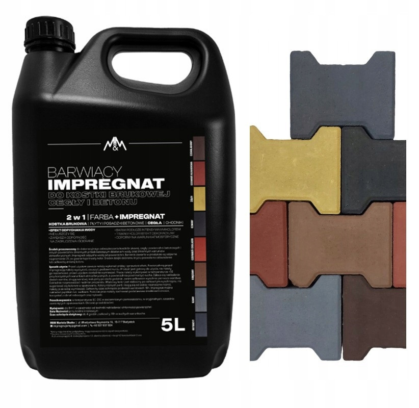 Impregnat barwiący przeznaczony do dekoracyjnego zabezpieczania kostki brukowej, cegły, powierzchni betonowych i innych powierzchni chłonnych przed niszczącym działaniem wody oraz zmiennych warunków atmosferycznych.
