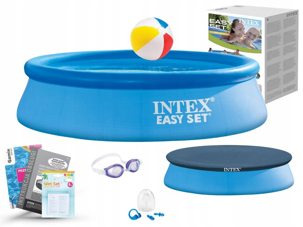 1. BASEN ROZPOROWY - basen Easy Set firmy Intex o rozmiarze 244 cm x 61 cm - pojemność 1 942 l. Producent wskazuje wypełnienie wodą, maksymalnie na poziomie 80%. Czas montażu wynosi około 10 minut.