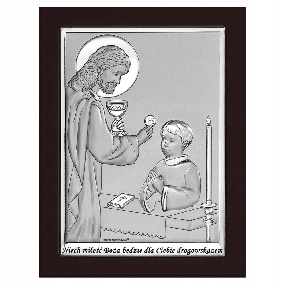 Prezentujemy śliczny, posrebrzany prezent na komunię dla chłopca w ciemnej, brązowej oprawie. Srebrny obrazek komunijnyto dzieło włoskiej firmy Beltrami. Wykonany jest z niezwykłą precyzją i dbałością o szczegóły, co zapewnia wyjątkowość naszego produktu. Obrazek stanowi idealny upominek tej wyjątkowej okazji i może być wręczony od chrzestnej, chrzestnego, od babci, od cioci lub od rodziców.