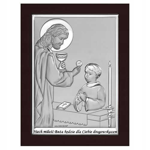 Pamiątka na komunię to ciekawe połączenie brązowego drewna oraz ekskluzywnej plakietki srebrnej. Przedstawia Jezusa i chłopca przystępującego do Komunii. Nowoczesny prezent na komunię w postaci srebrnego obrazka jest gustownie zdobiony detalami, nadając mu elegancki i wyjątkowy wygląd. Wybrane posrebrzane elementy pięknie lśnią uwydatniając piękno użytego, do wykonania obrazka, srebra.