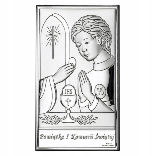 Pamiątka na komunię przedstawia chłopca przystępującego do I Komunii. Nowoczesny prezent na komunię w postaci srebrnego obrazka jest gustownie zdobiony detalami, nadając mu elegancki i wyjątkowy wygląd. Wybrane posrebrzane elementy pięknie lśnią uwydatniając piękno użytego, do wykonania obrazka, srebra.