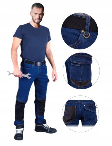 ELASTYCZNE SPODNIE OCHRONNE DO PASA WYKONANE Z JEANSU. KOLOR GRANATOWY. ROZMIAR 46