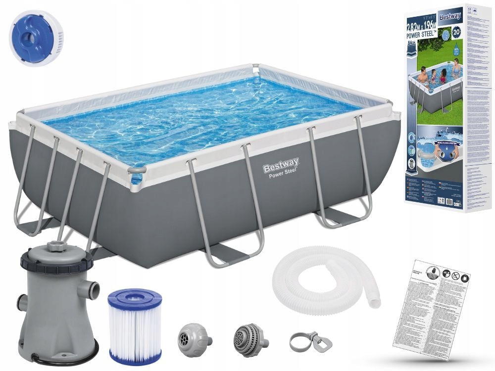 1. BASEN STELAŻOWY - basen Power Steel firmy Bestway o rozmiarze 282 cm x 196 cm x 84 cm - pojemność 3 662 l. Producent wskazuje wypełnienie wodą, maksymalnie na poziomie 90%.