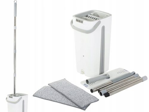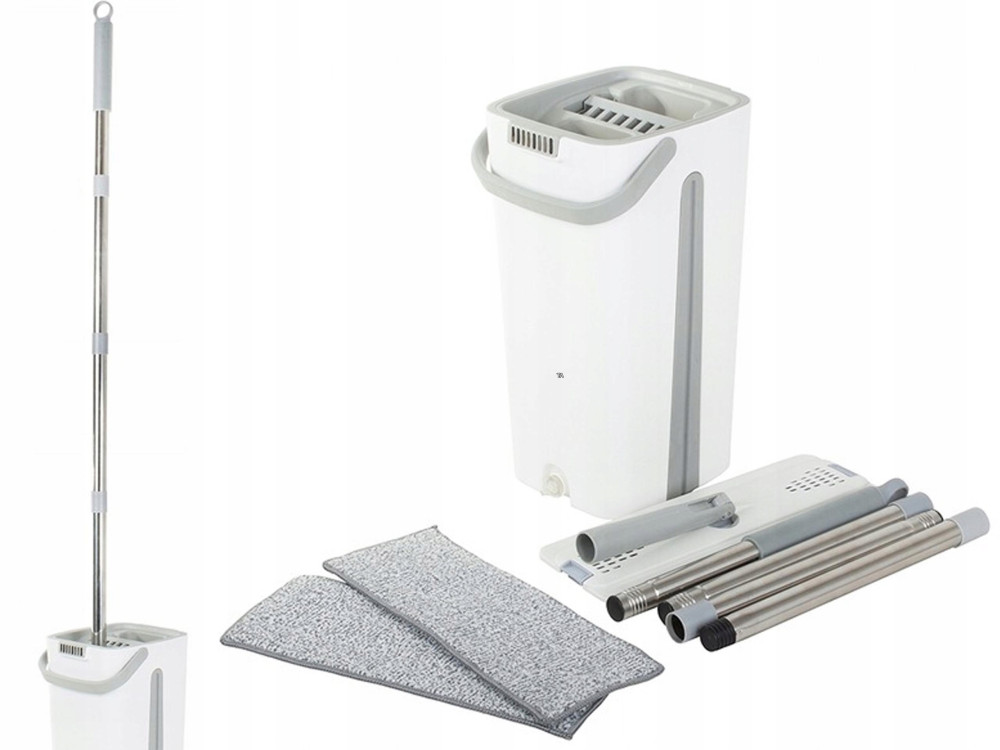 Mop wyposażony jest w dwukomorowe wiadro z wyciskaczem. Podczas płukania mopa, nieczystości pozostają w pojemniku z brudną wodą, natomiast podczas wyciskania w drugiej komorze, woda wpływa do komory na brudną wodę jednocześnie przepłukując go w czystej wodzie. Nawet jeśli sprzątanie, nie należy do Twoich ulubionych zajęć, z pewnością błyskawicznie polubisz ten innowacyjny sprzęt czyszczący.