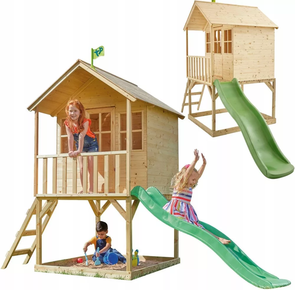 Ten uroczy przestronny drewniany domek na palach z werandą stanie się ulubionym miejscem do zabawy i spędzania czasu na świeżym powietrzu. Domek został wykonany z naturalnego, certyfikowanego drewna FSC, co nadaje mu rustykalny i przytulny wygląd. Domek jest przestronny i wygodny a podłoga wyłożona jest wytrzymałymi deskami. Maksymalna łączna waga użytkowników domku to 150kg. Dzięki temu dzieci będą miały duże, mocne, wygodne i bezpieczne miejsce do zabawy.