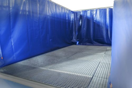 Myjnia posiada dużą zlewnię wraz z kratownicą roboczą otoczoną ścianami z kotar z pcv lub blachy chromoniklowej.