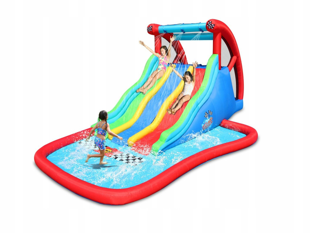 Ta ogromna, potrójna zjeżdżalnia z basenem to najnowszy hit marki HappyHop na rok 2021! Dmuchaniec bez przeszkód może być używany na sucho, bez użycia wody, a zabawa będzie tak samo dobra. Dzieci mogą na nim rywalizować, kto szybciej zjedzie, a przy tym będą całkowicie bezpieczne, bo w dmuchańcu zastosowano specjalną, solidną siatkę zabezpieczającą przed wypadnięciem.