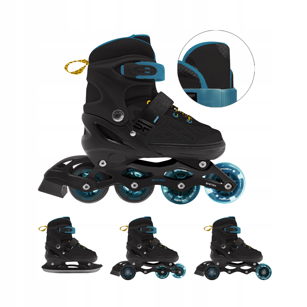 Spokey QUATTRO to nowoczesne rozwiązanie - z nimi Twoje dziecko będzie mogło spędzać czas aktywnie zarówno latem, jak i w zimie na lodowisku. Posiadają dwie wymienne płozy: łyżwową oraz rolkową, którą można konfigurować na trzy różne sposoby! QUATTRO mogą być więc łyżwami (z płozą hokejową wykonaną ze stali), rolkami (4 kółka w rzędzie), wrotkami (kółka po bokach płozy) i rolko-wrotkami (2 kółka w rzędzie z przodu, tylne ustawione po bokach płozy). Są doskonałym wyborem dla dzieci, które uwielbiają jazdę na lodowisku, a wiosną czy latem czerpią totalną przyjemność z aktywnego spędzania czasu na świeżym powietrzu.