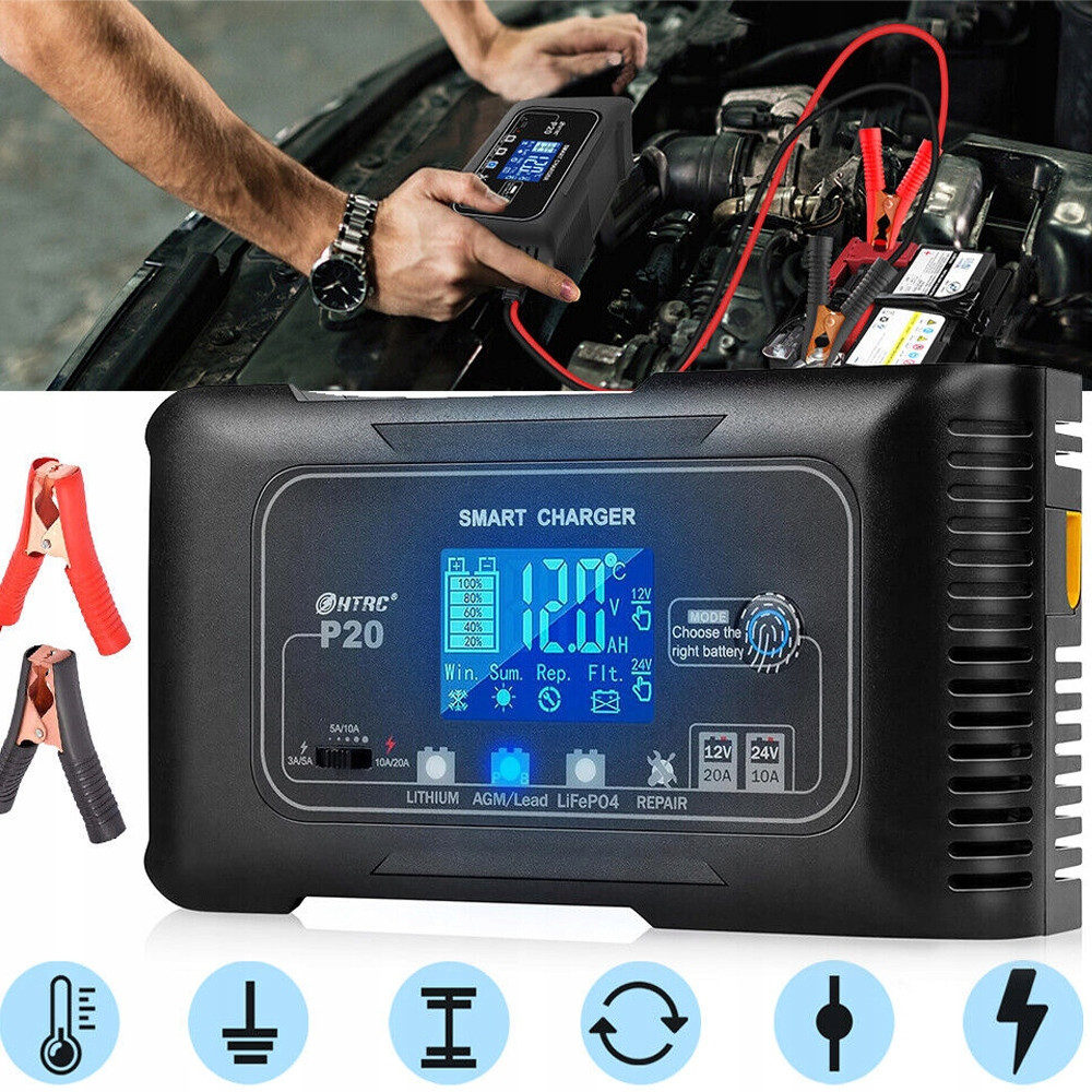 ⚡ 12V 20A.24V 10A, w pełni automatyczna inteligentna ładowarka z kompensacją temperatury i ekranem dotykowym LCD, ładowarka podtrzymująca do samochodu, motocykla i łodzi.