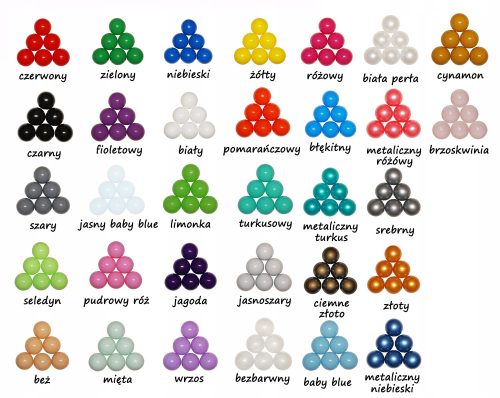 Oferowane piłeczki o średnicy 7 cm są dostępne w 33 kolorach: czerwony, zielony, niebieski, żółty, różowy, błękitny, biały, pomarańczowy, szary, fioletowy, limonka, turkusowy, seledyn, pudrowy róż, jagoda, jasnoszary, beżowy, mięta, wrzos, bezbarwny, cynamon, czarny, baby blue, ciemne złoto, metaliczny niebieski, biała perła, metaliczny turkus, złoty, srebrny, metaliczny róż, brzoskwinia, jasny baby blue.